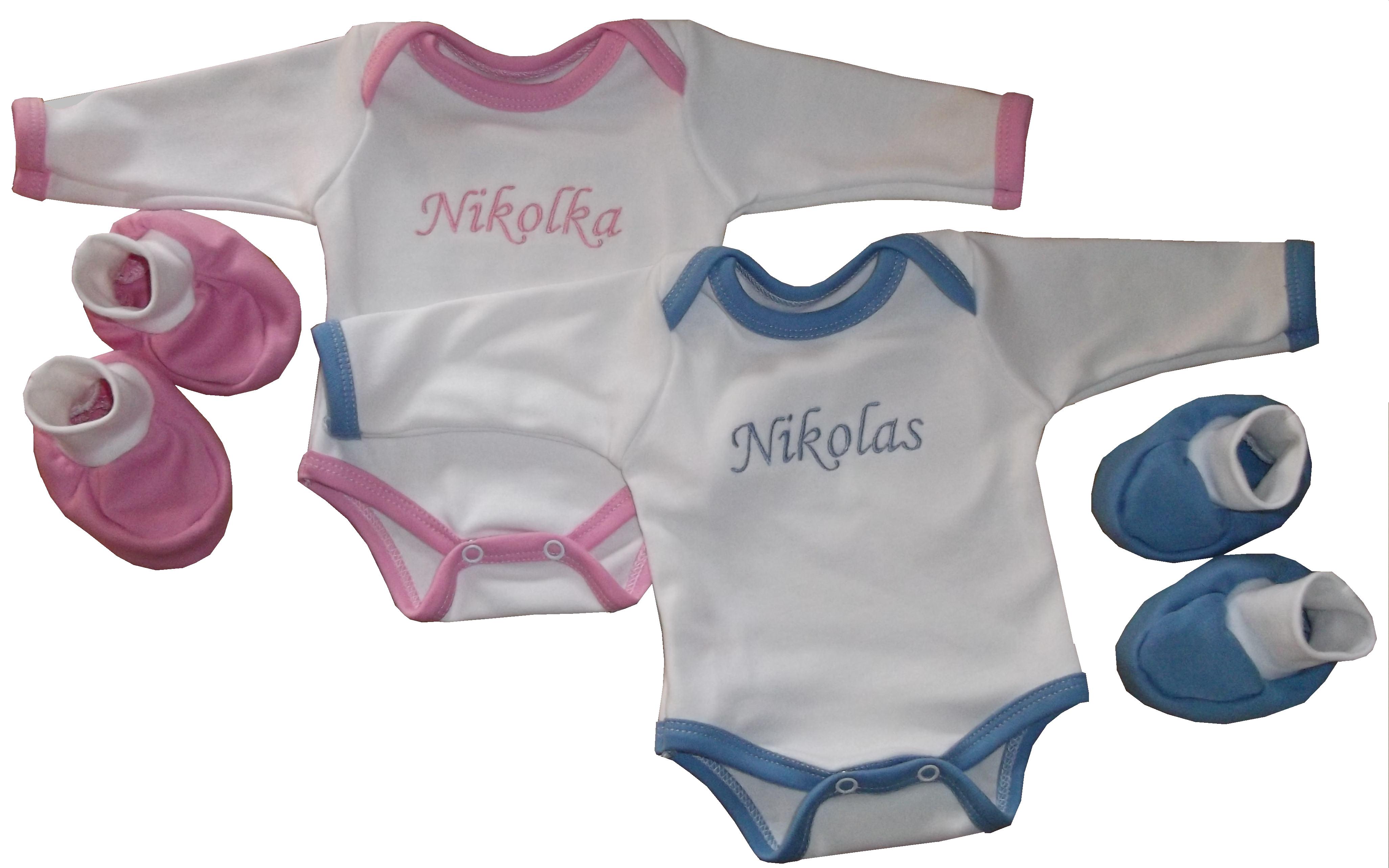 dárková soupravička bodýčka se jménem a capáčky, světle modrá, růžová a bílá, bavlněný úplet, výšivka