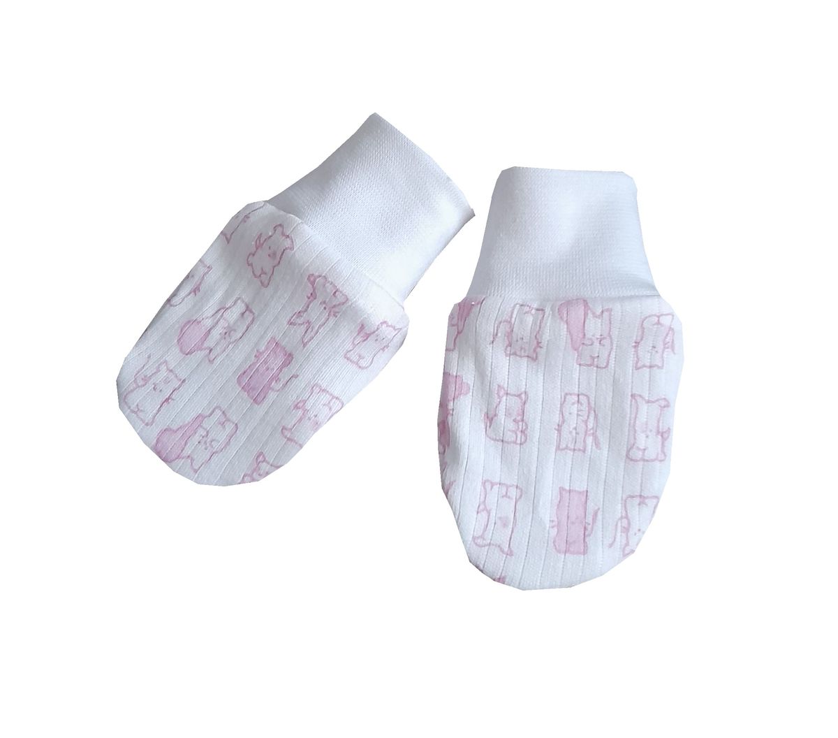 bavlněný úplet, kolem ručičky pružný lem. Rukavičky u miminek zabraňují poškrábání, doporučujeme i pro letní miminka.