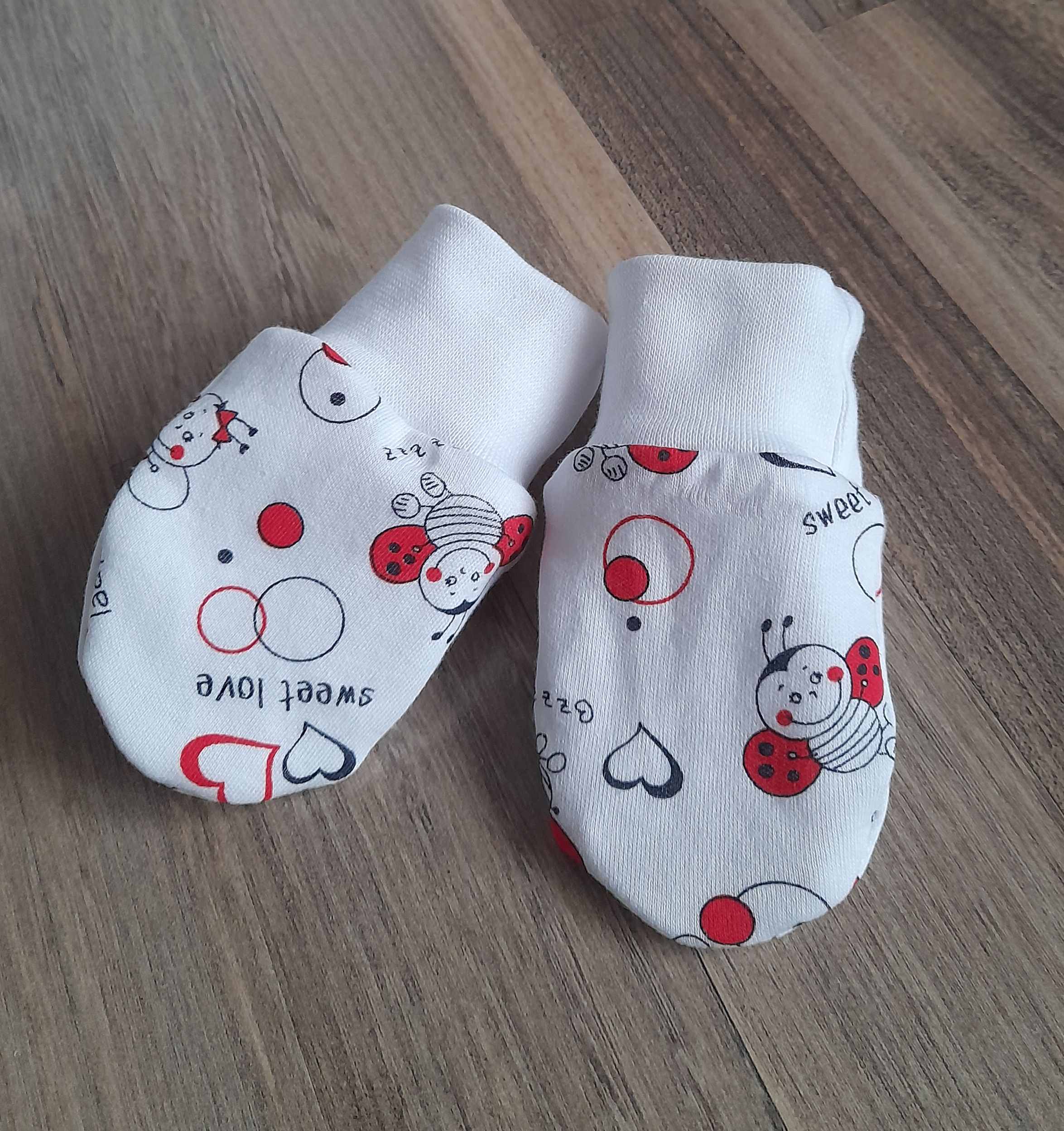 bavlněný úplet, kolem ručičky pružný lem. Rukavičky u miminek zabraňují poškrábání, doporučujeme i pro letní miminka.