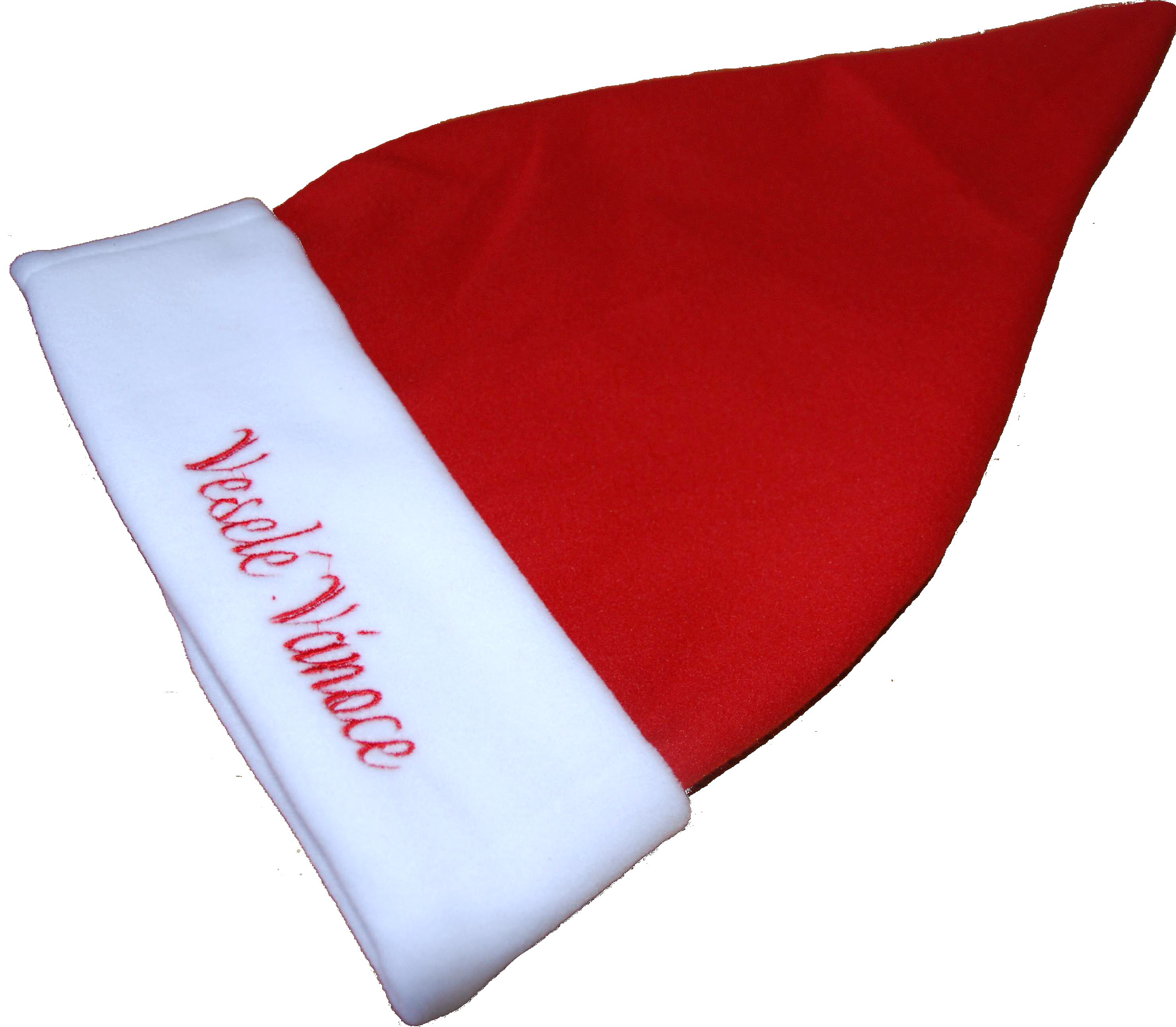 zimní flísová čepička typu "skřítek" s dlouhým cípem, na lemu výšivka Veselé Vánoce