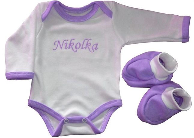 dárková soupravička bodýčka se jménem a capáčky, fialová a bílá, bavlněný úplet, výšivka