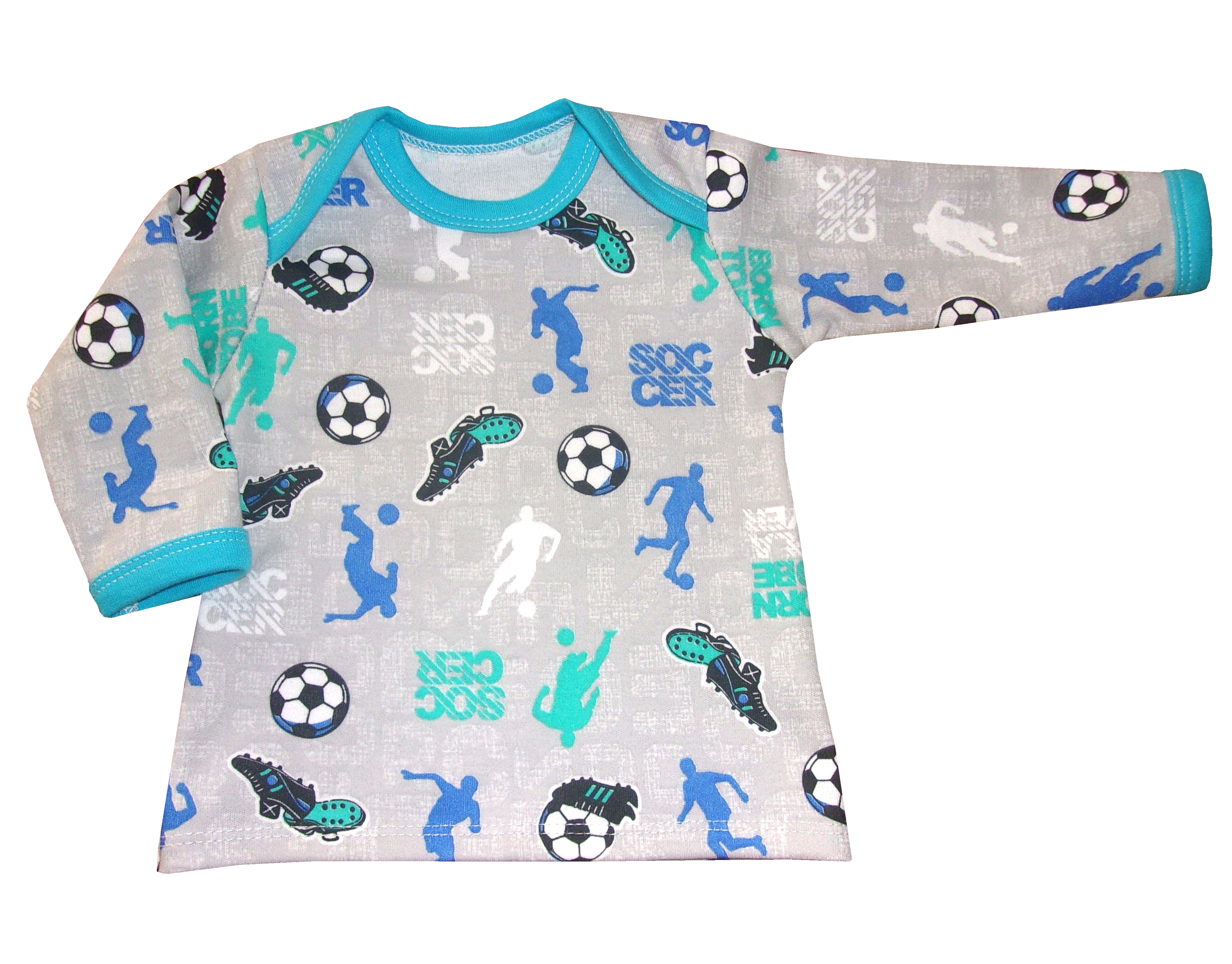 kojenecké tričko s dlouhým rukávem, fotbalový motiv, oblíbená barevná kombinace šedá a tyrkysová