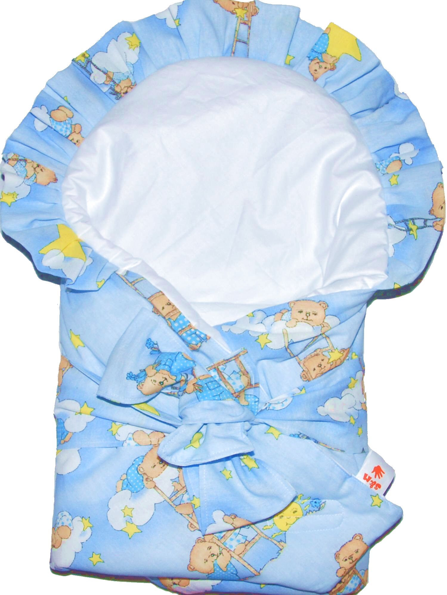 Zavinovačka z bavlněného plátna, vnitřní strana bílá, vnější modrá a medvídci. Výplň polyester - duté vlákno. Zavinovačka se zapíná na suché zipy zaobleného tvaru, aby neškrábaly. Zavinovačka se snadno udržuje. Až bude miminku zavinovačka malá, lze ji používat jako hrací podložku nebo po odstranění zipů i jako přikrývku. Zavinovačka je ušitá z plátna s atestem pro děti. Výplň má zavinovačka z dutého vlákna.